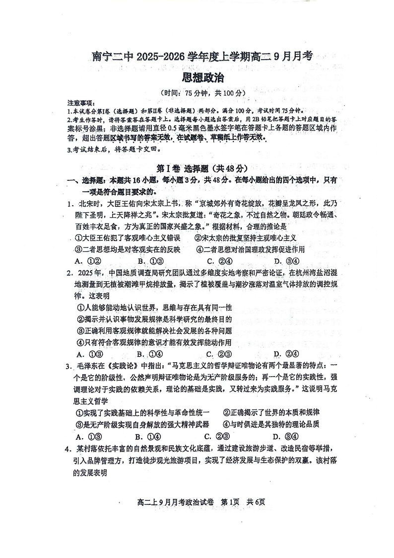 高二政治--广西南宁二中2025-2026学年上学期高二9月月考
