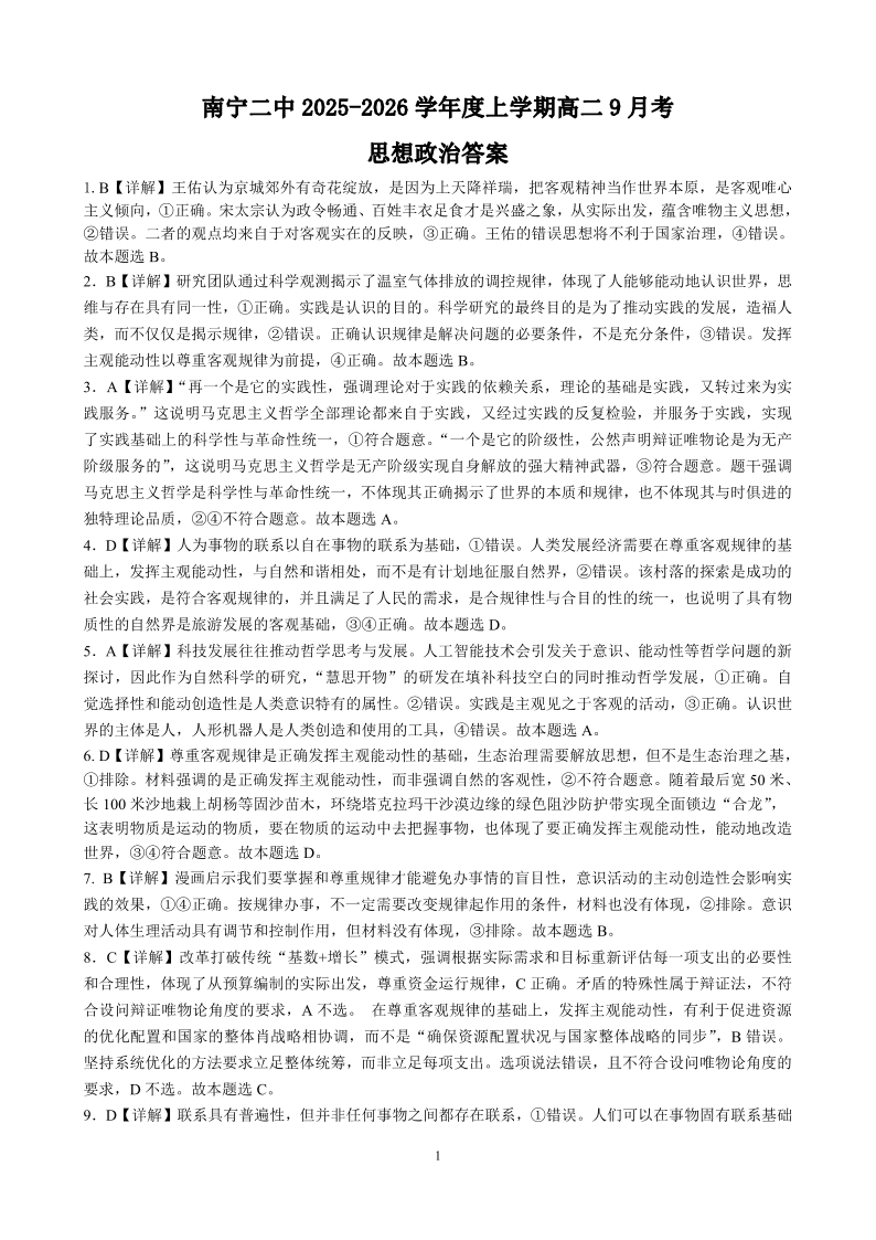 高二政治答案--广西南宁二中2025-2026学年上学期高二9月月考