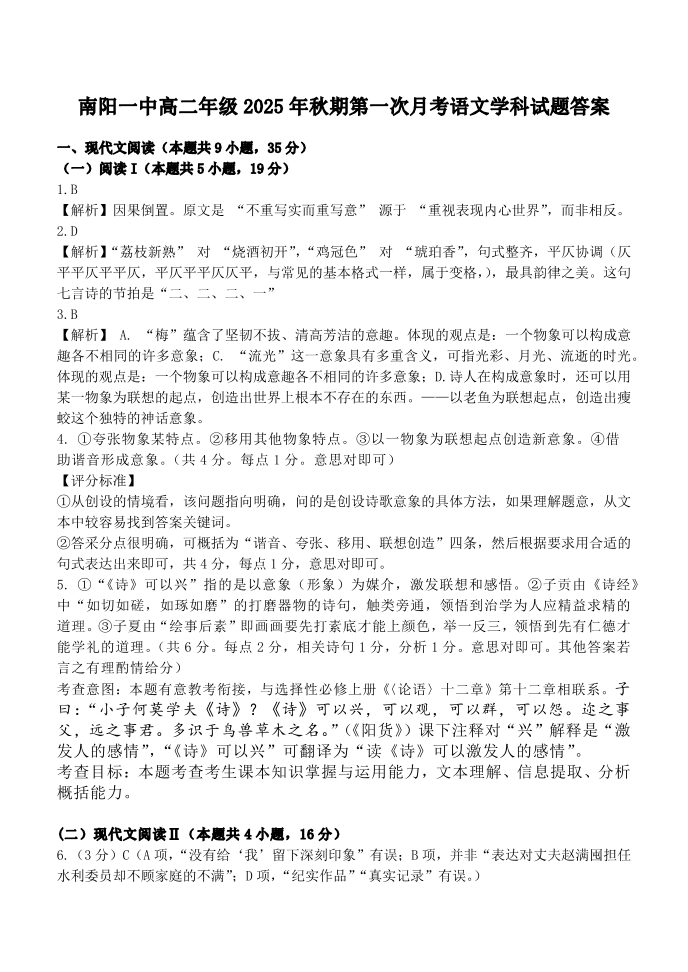 高二语文答案--河南省南阳市第一中学校2025-2026学年高二上学期第一次月考