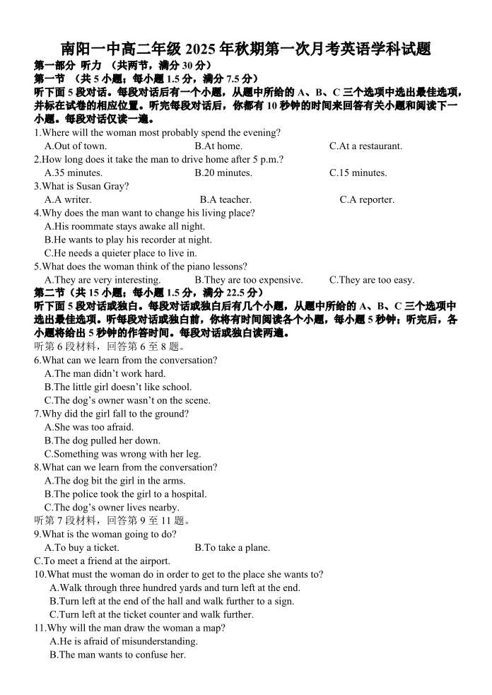 高二英语+答案--河南省南阳市第一中学校2025-2026学年高二上学期第一次月考