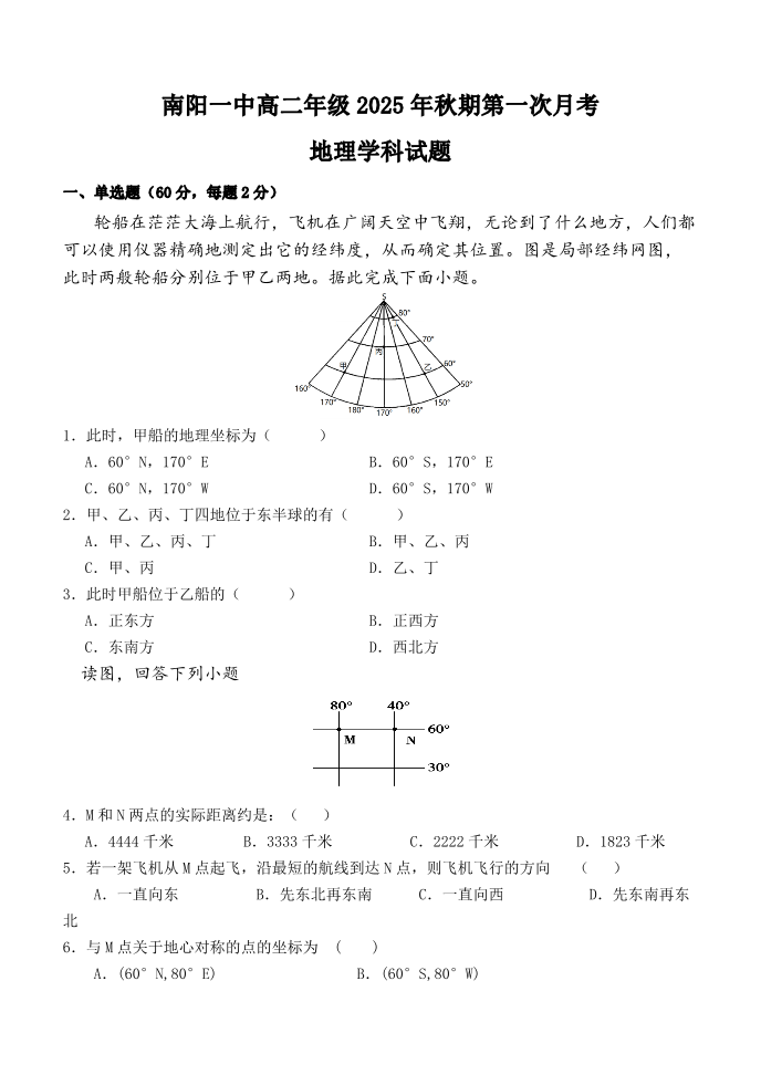 高二地理--河南省南阳市第一中学校2025-2026学年高二上学期第一次月考
