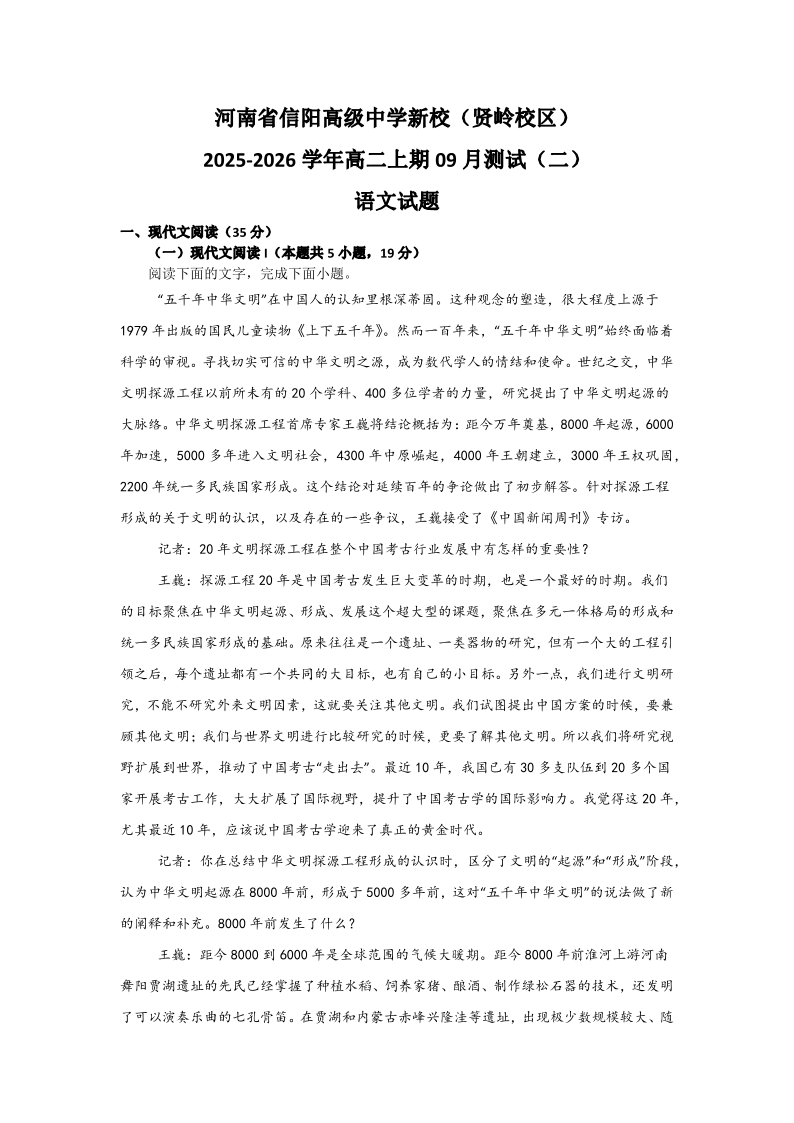 高二语文--河南省信阳市浉河区信阳高级中学2025-2026学年高二上学期9月月考