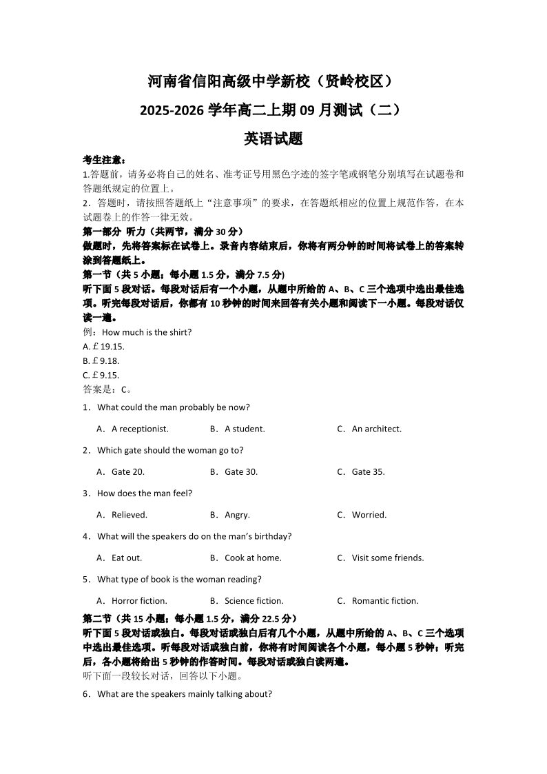 高二英语--河南省信阳市浉河区信阳高级中学2025-2026学年高二上学期9月月考