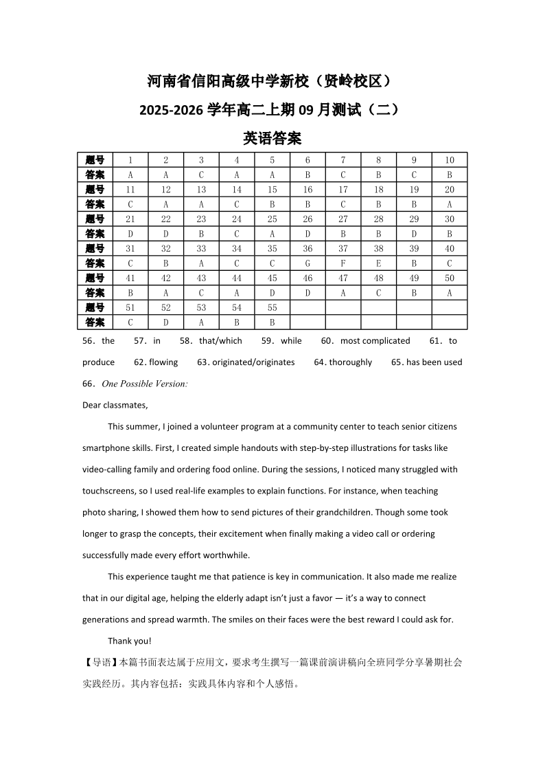 高二英语答案--河南省信阳市浉河区信阳高级中学2025-2026学年高二上学期9月月考