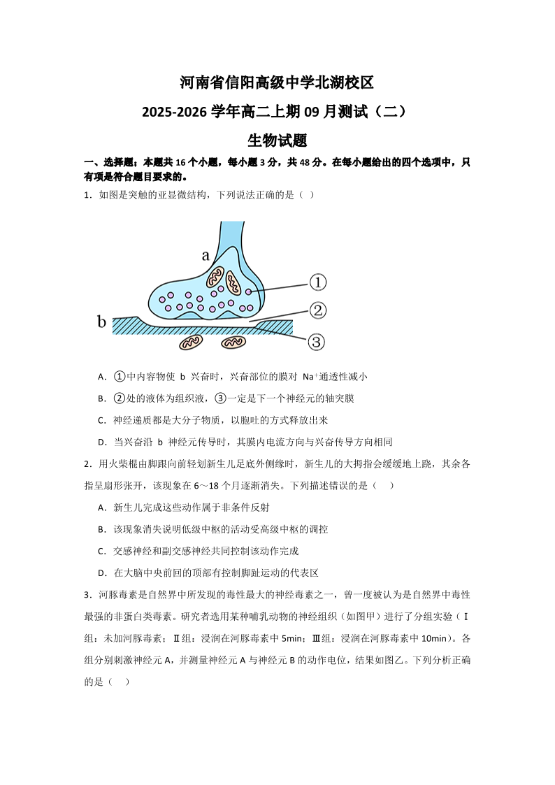 高二生物--河南省信阳市浉河区信阳高级中学2025-2026学年高二上学期9月月考