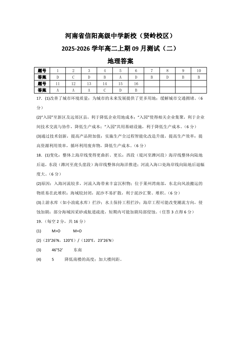 高二地理答案--河南省信阳市浉河区信阳高级中学2025-2026学年高二上学期9月月考