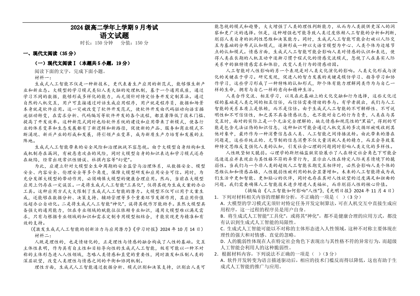 高二语文--黑龙江省牡丹江市第一高级中学2025-2026学年高二上学期9月月考