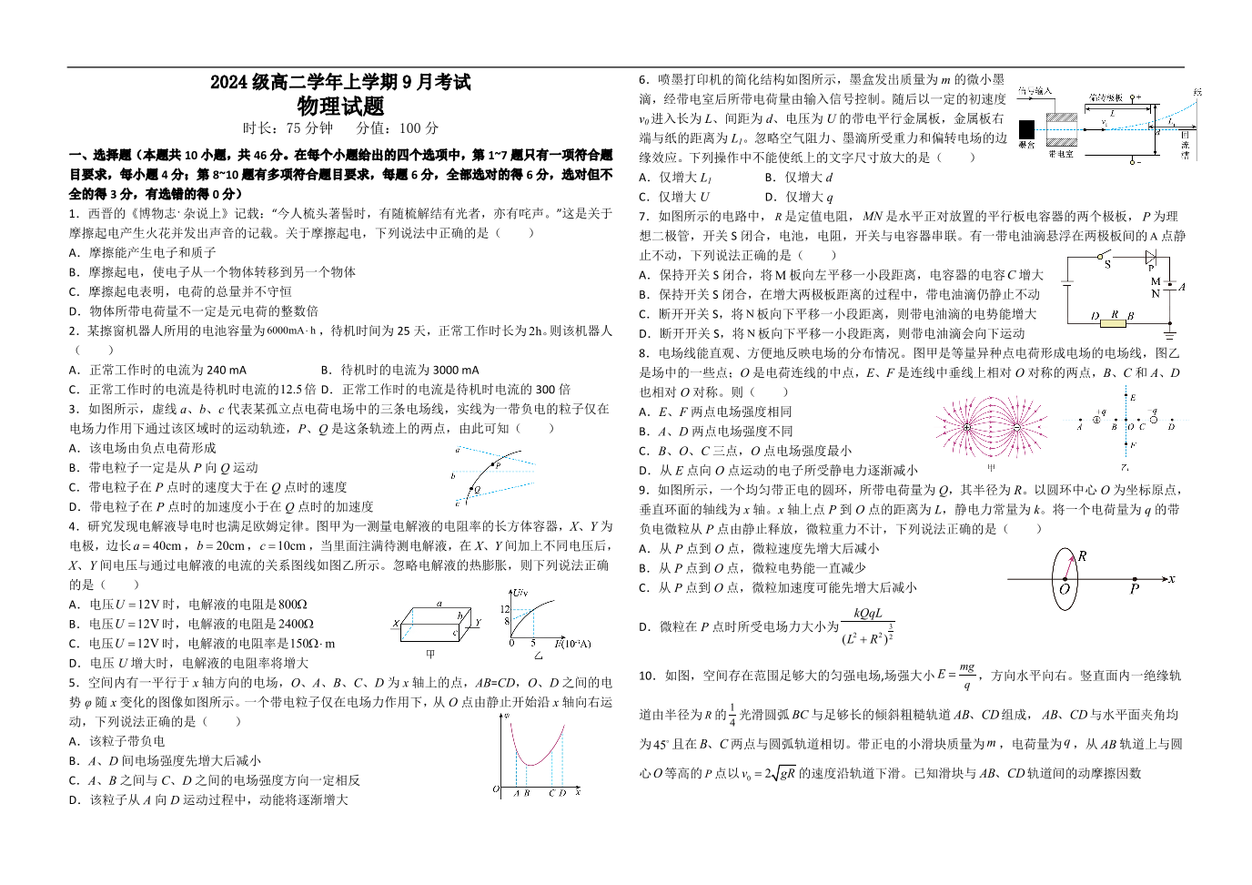 高二物理(平行班)--黑龙江省牡丹江市第一高级中学2025-2026学年高二上学期9月月考