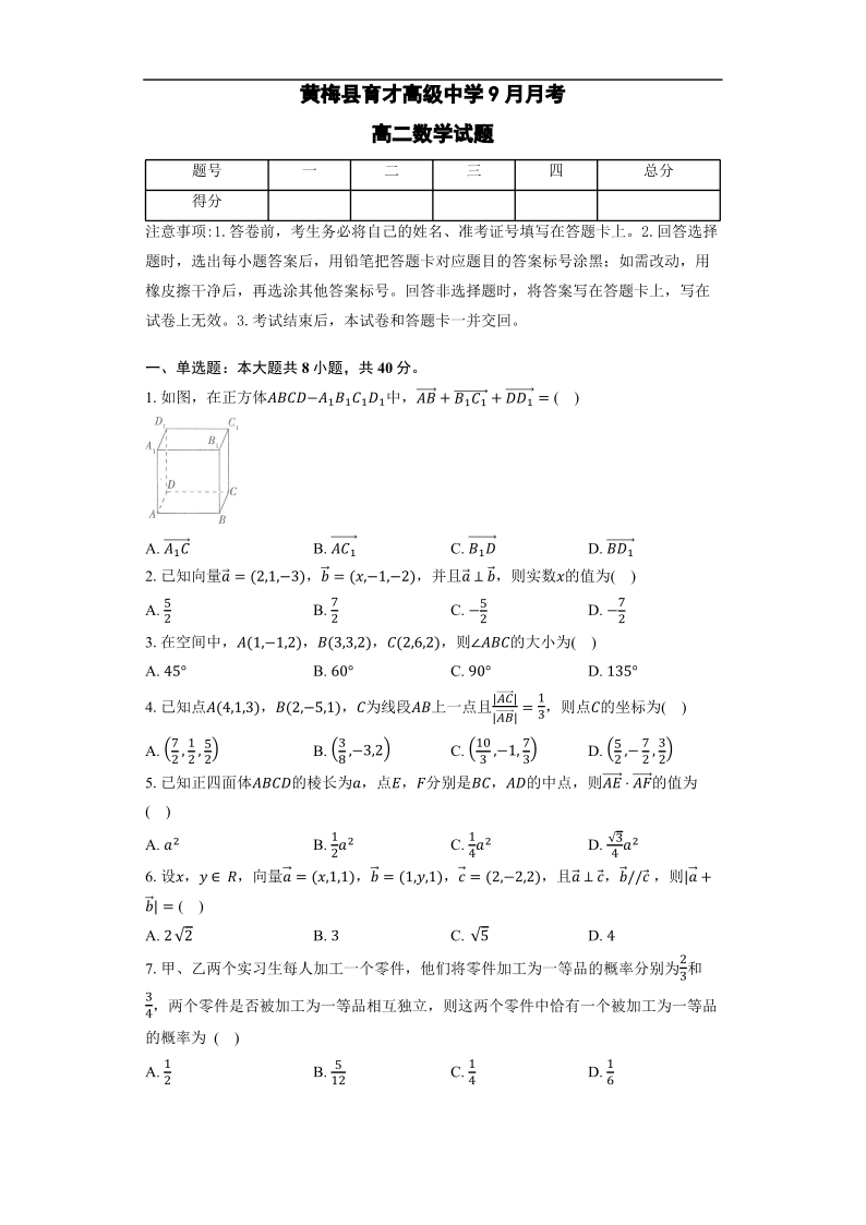 高二数学+答案--湖北省黄冈市黄梅县育才高级中学2025-2026学年高二上学期9月月考