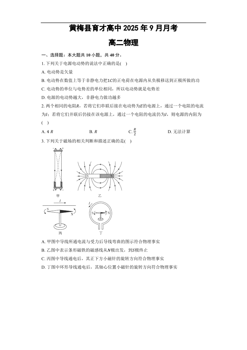 高二物理+答案--湖北省黄冈市黄梅县育才高级中学2025-2026学年高二上学期9月月考