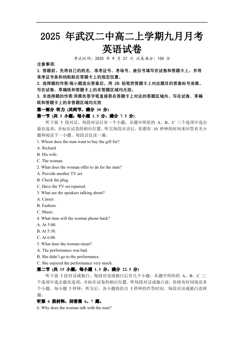 高二英语+答案--湖北省武汉市第二中学2025-2026学年高二上学期9月月考