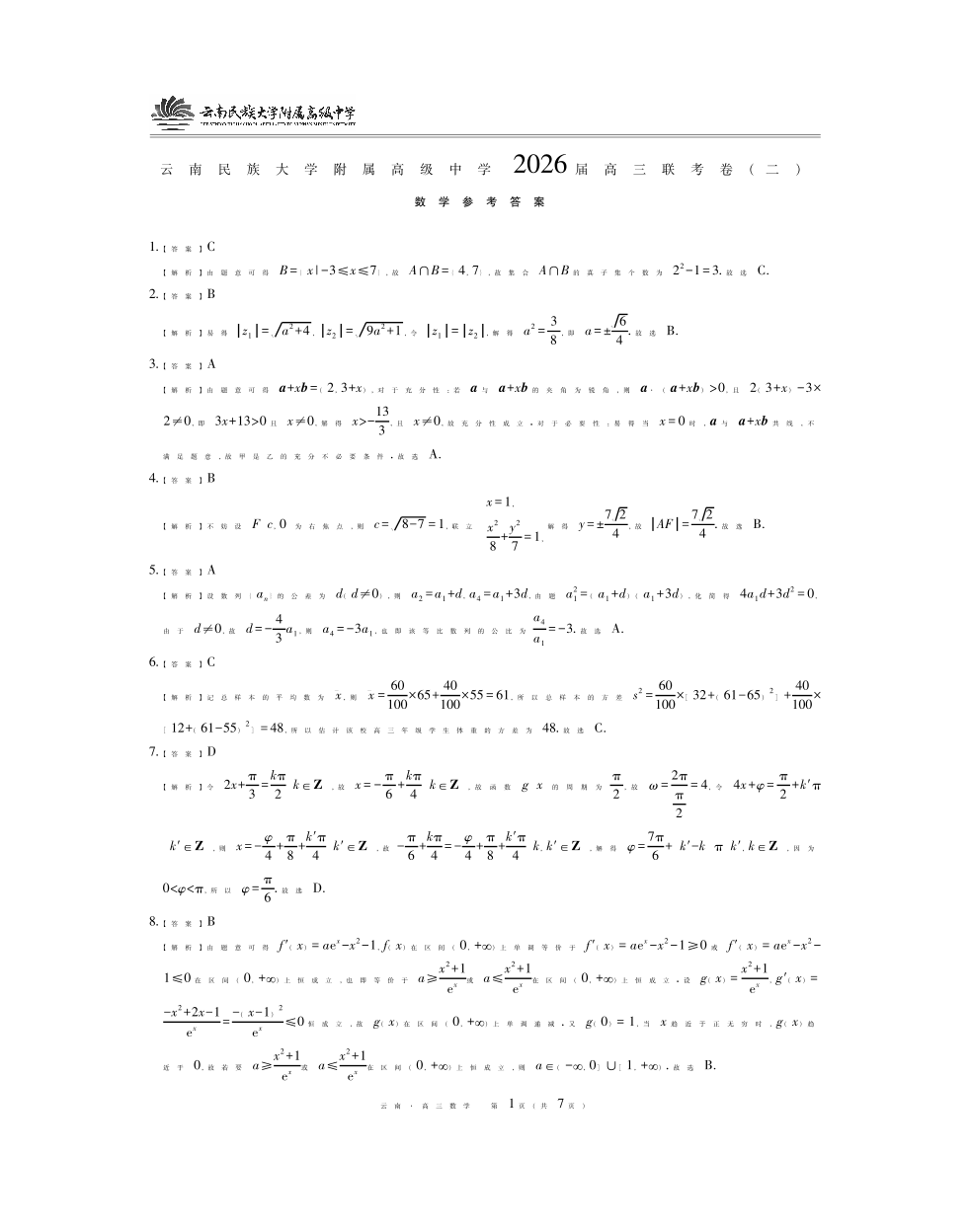 高三数学答案--云南民族大学附属高级中学2026届高三联考卷(二)