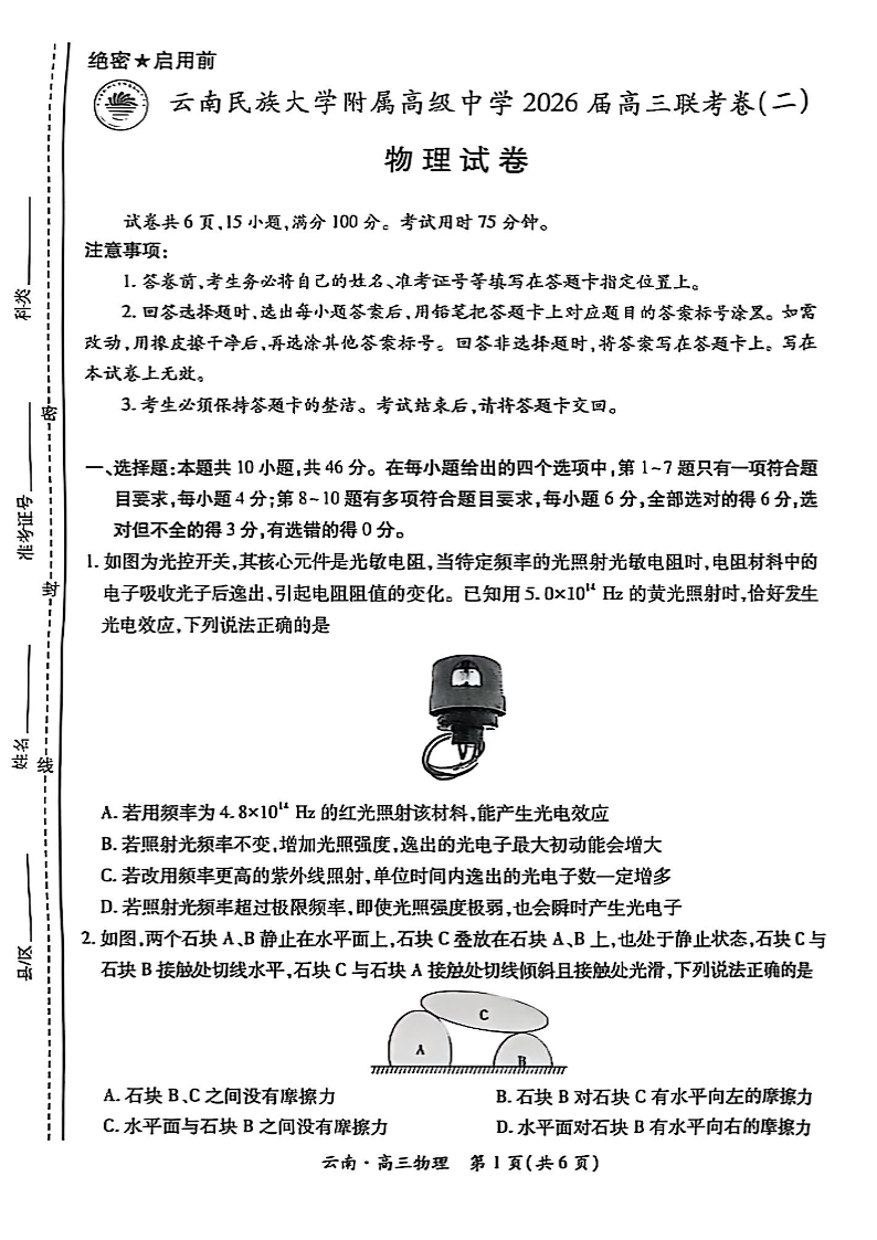 高三物理--云南民族大学附属高级中学2026届高三联考卷(二)