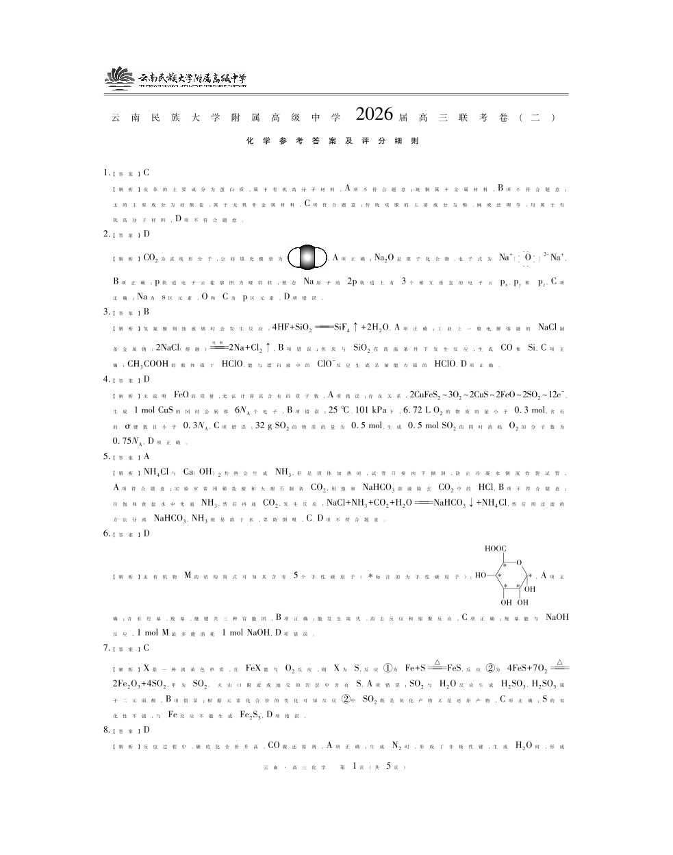 高三化学答案--云南民族大学附属高级中学2026届高三联考卷(二)