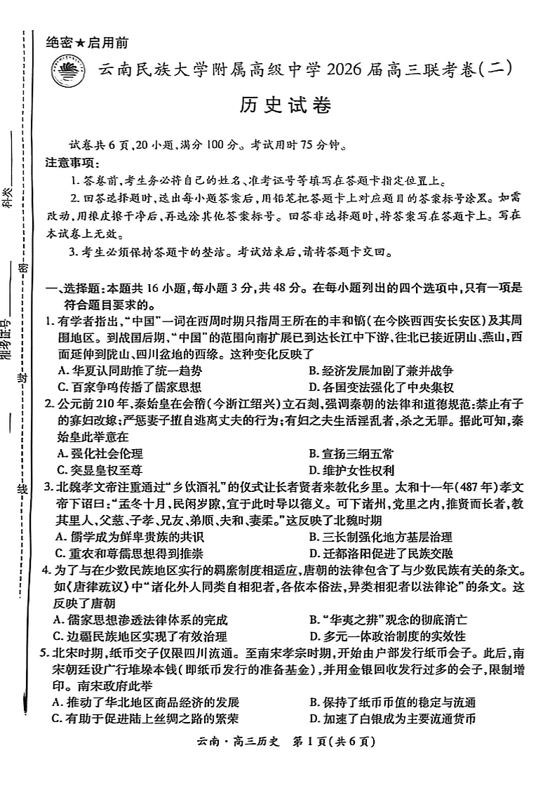高三历史--云南民族大学附属高级中学2026届高三联考卷(二)