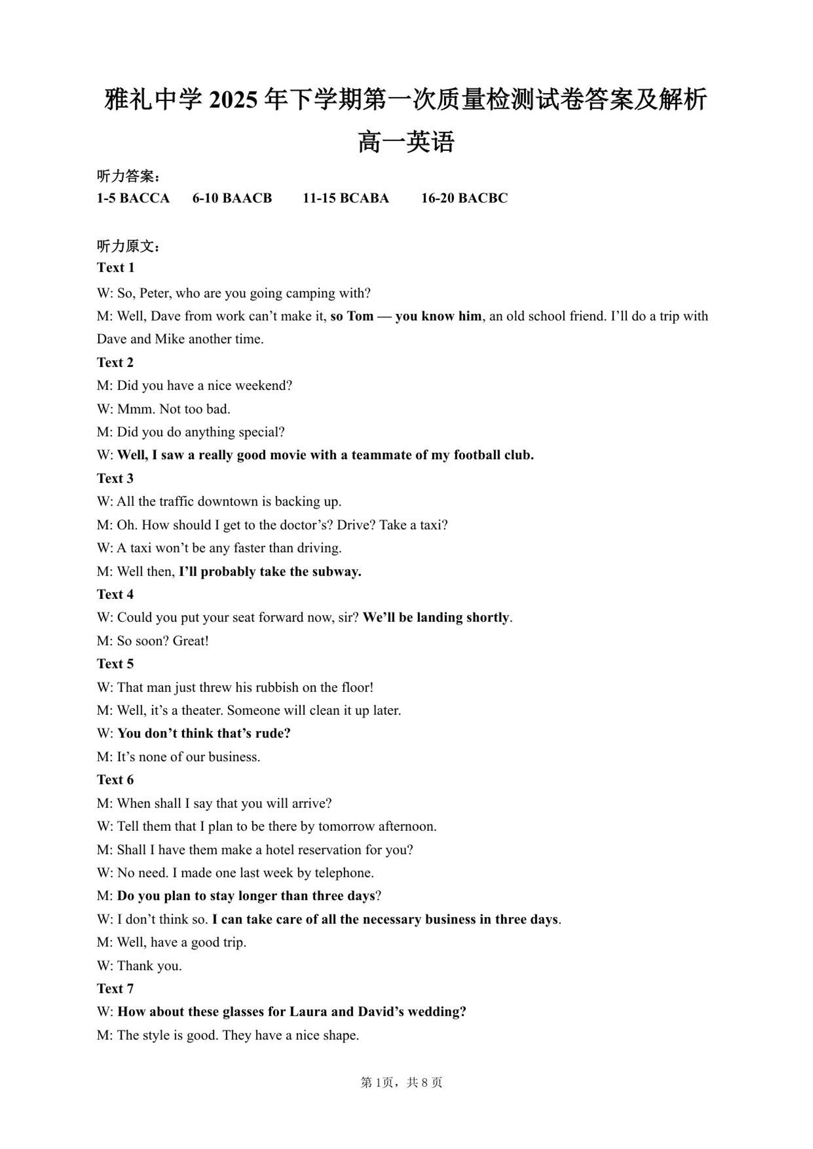 高一英语答案--湖南省长沙市雅礼中学2025-2026学年高一上学期第一次(10月)质量检测