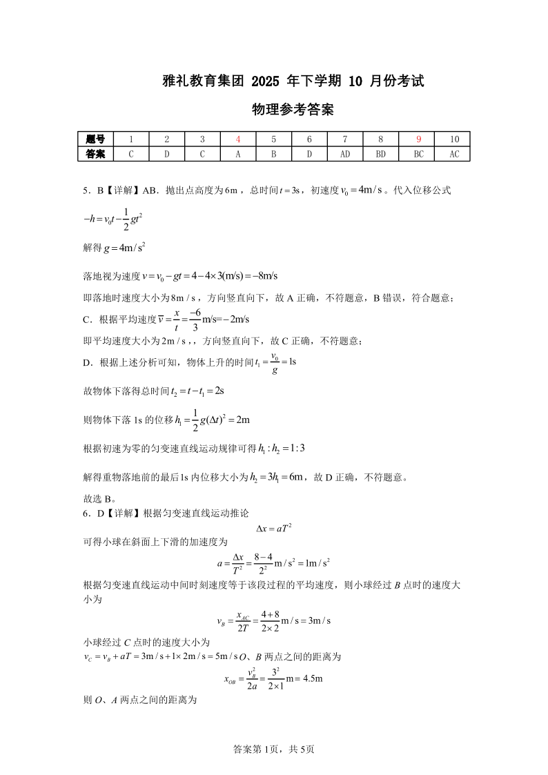 高一物理答案--湖南省长沙市雅礼中学2025-2026学年高一上学期第一次(10月)质量检测