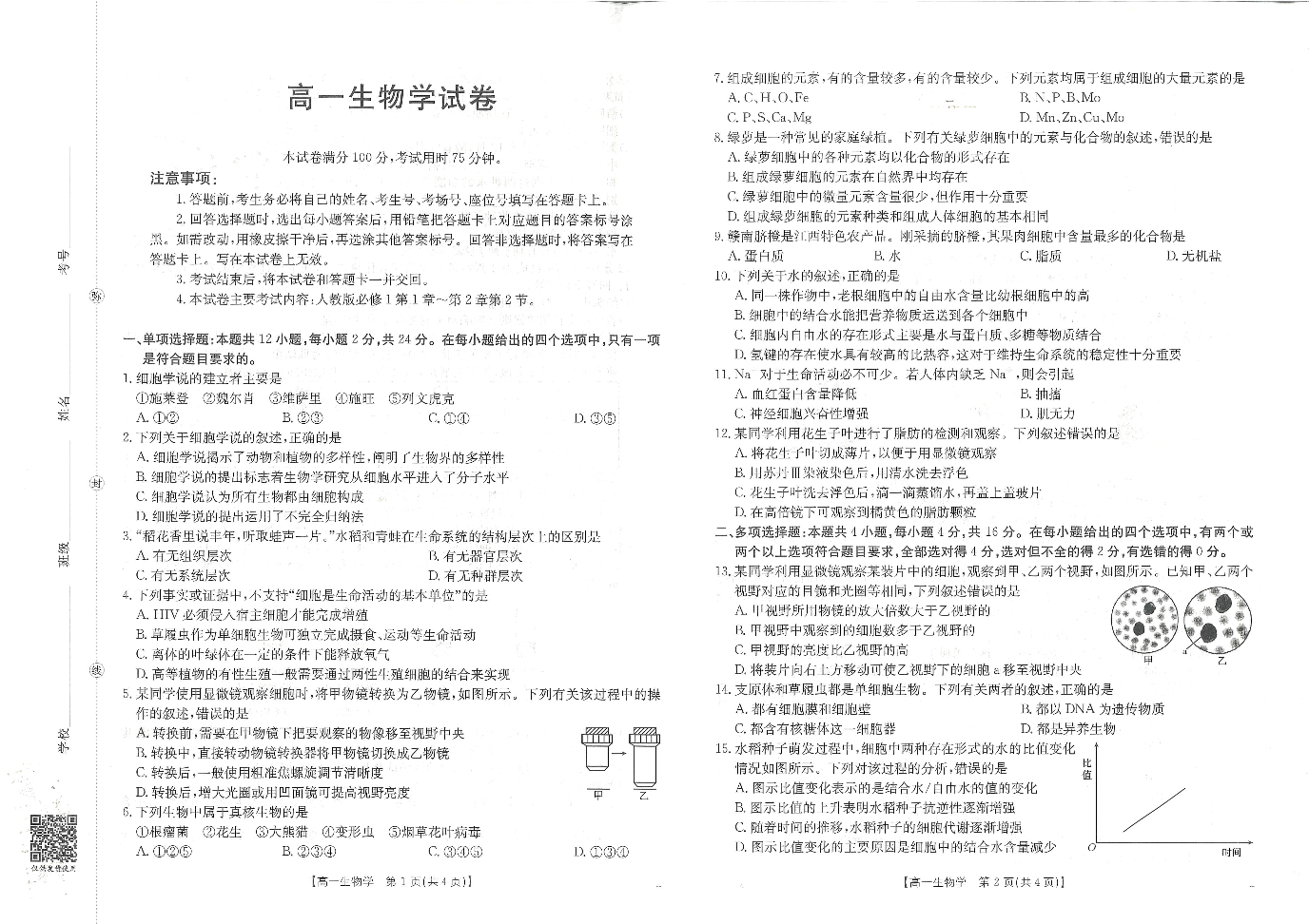 高一生物--江西省2025-2026学期高一上学期10月联考
