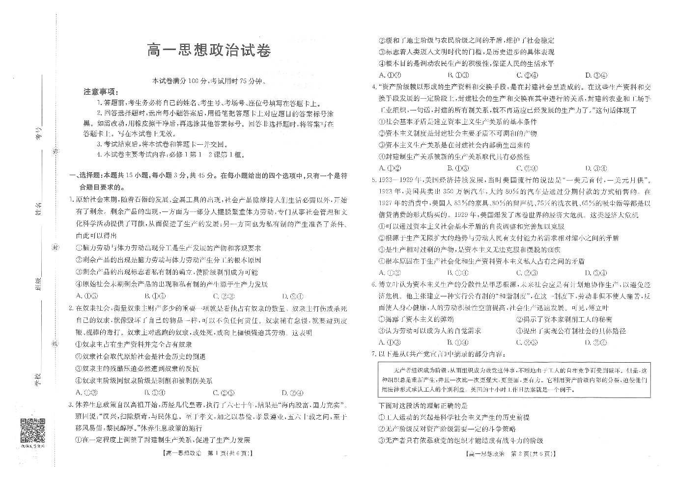 高一政治--江西省2025-2026学期高一上学期10月联考