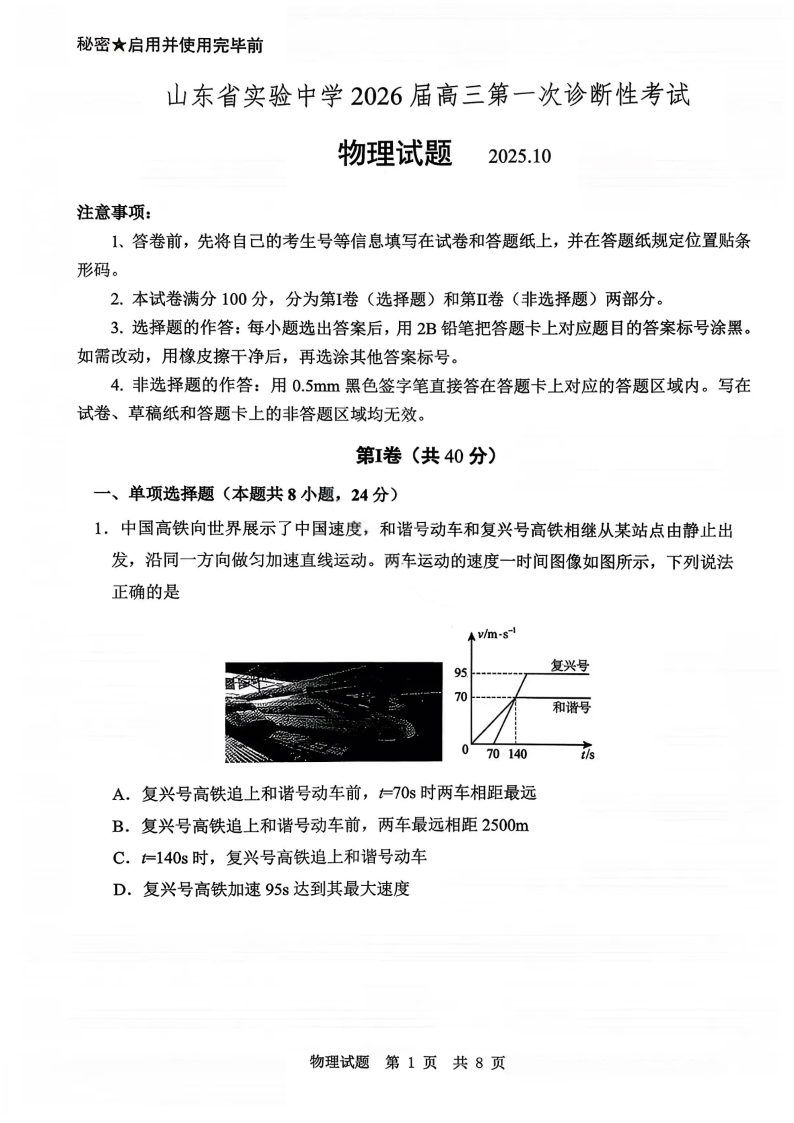高三物理--山东省实验中学2026届高三第一次诊断考试