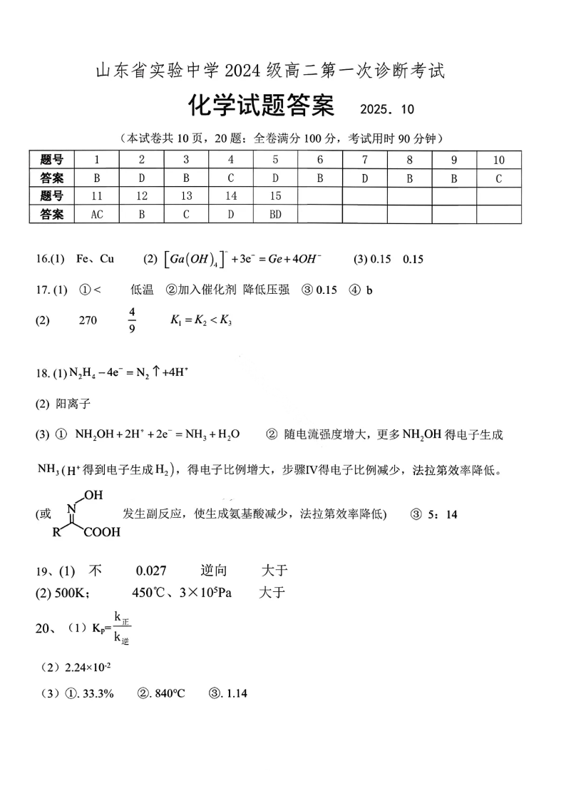 高三化学答案--山东省实验中学2026届高三第一次诊断考试
