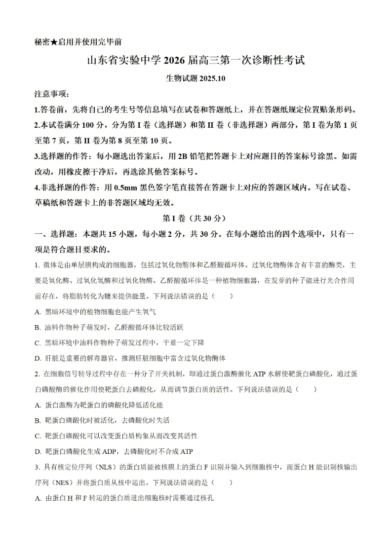 高三生物--山东省实验中学2026届高三第一次诊断考试