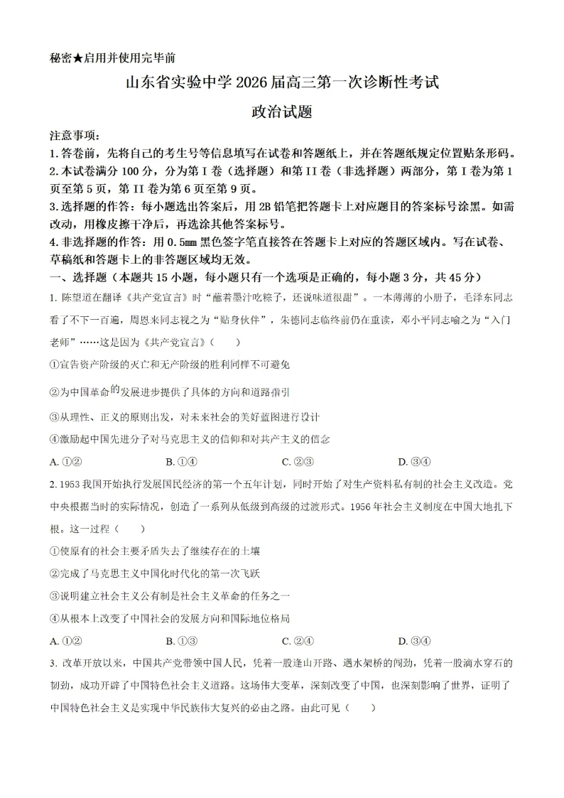 高三政治--山东省实验中学2026届高三第一次诊断考试