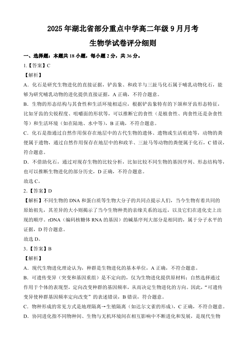 高二生物答案--湖北省咸宁市华师元一赤壁学校2025-2026学年高二上学期9月月考