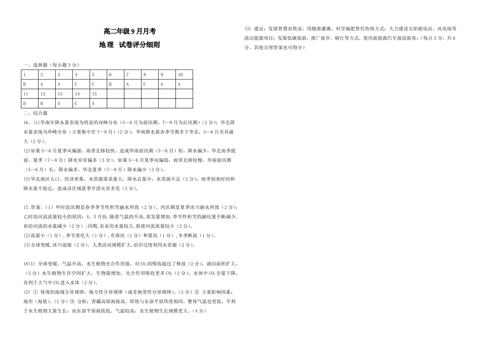 高二地理答案--湖北省咸宁市华师元一赤壁学校2025-2026学年高二上学期9月月考