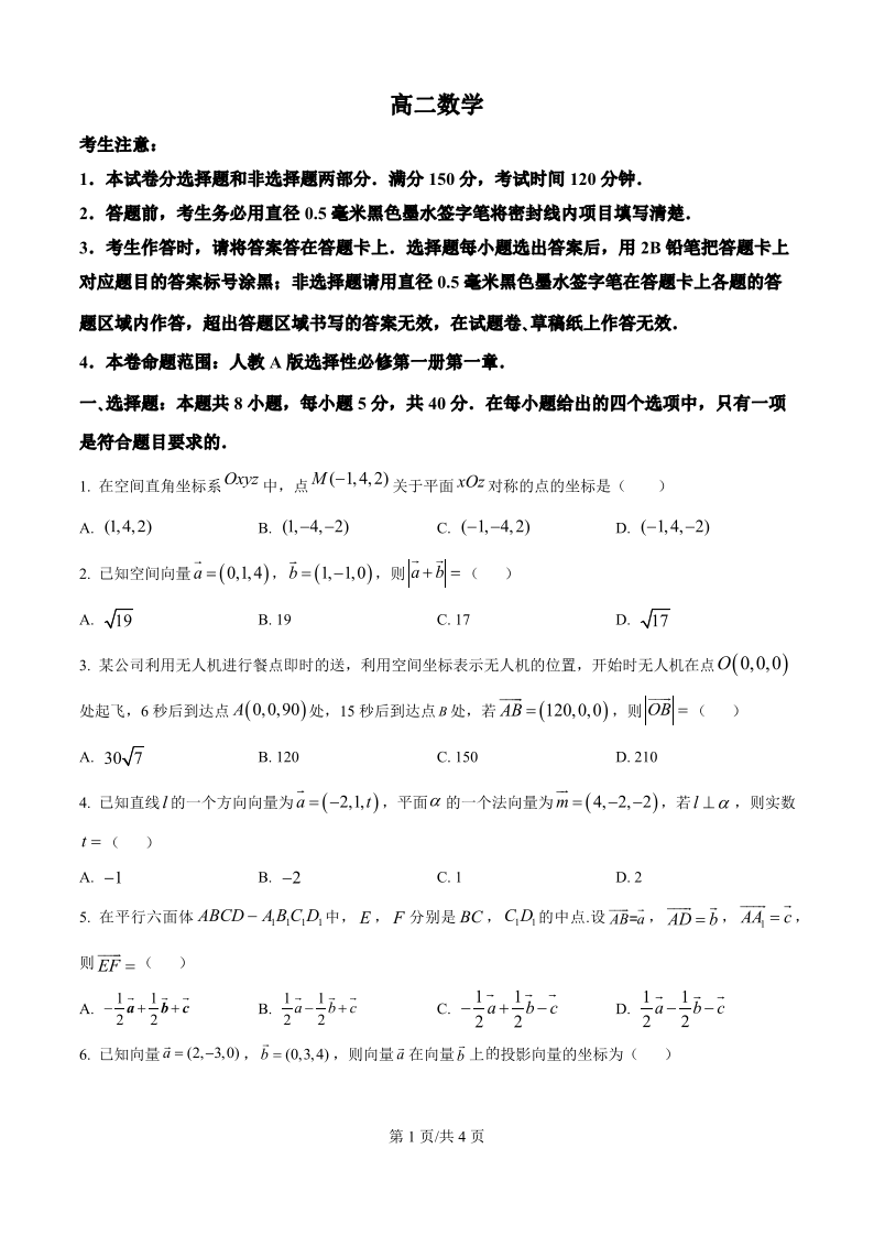 高二数学(原卷版)--吉林省四平市实验中学2025-2026学年高二上学期9月月考