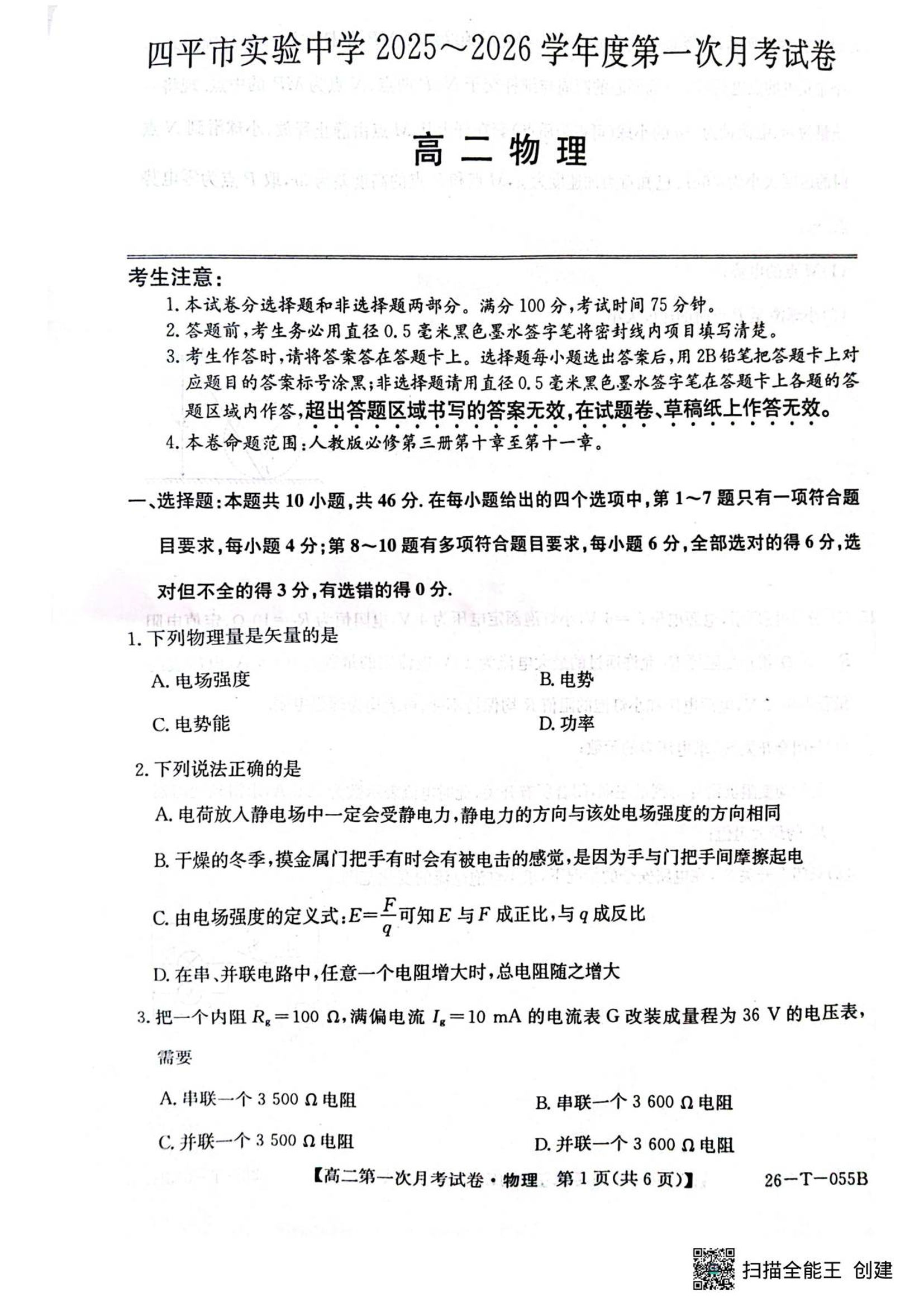 高二物理--吉林省四平市实验中学2025-2026学年高二上学期9月月考