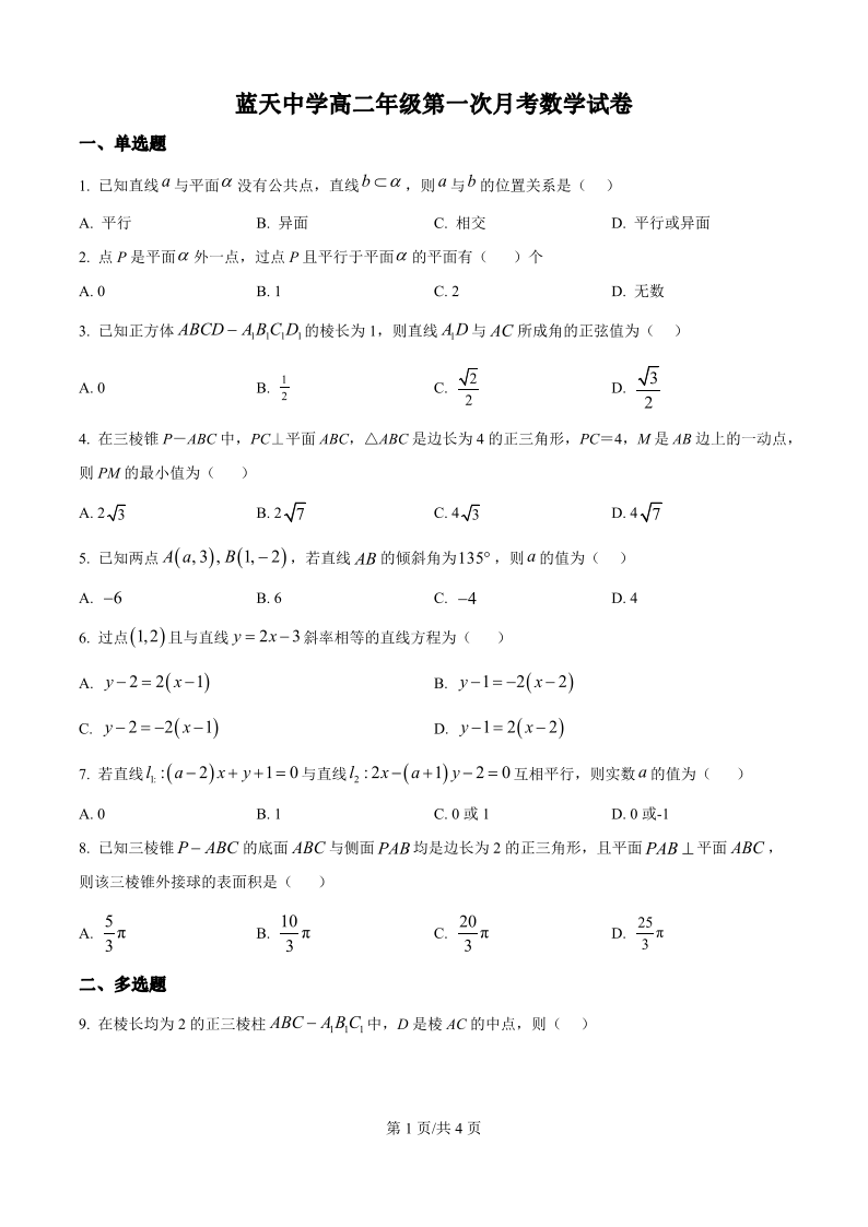 高二数学(原卷版)--江西省上饶市余干县私立蓝天中学2025-2026学年高二上学期第一次月考