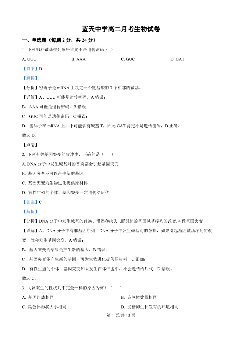 高二生物(精品解析版)--江西省上饶市余干县私立蓝天中学2025-2026学年高二上学期第一次月考