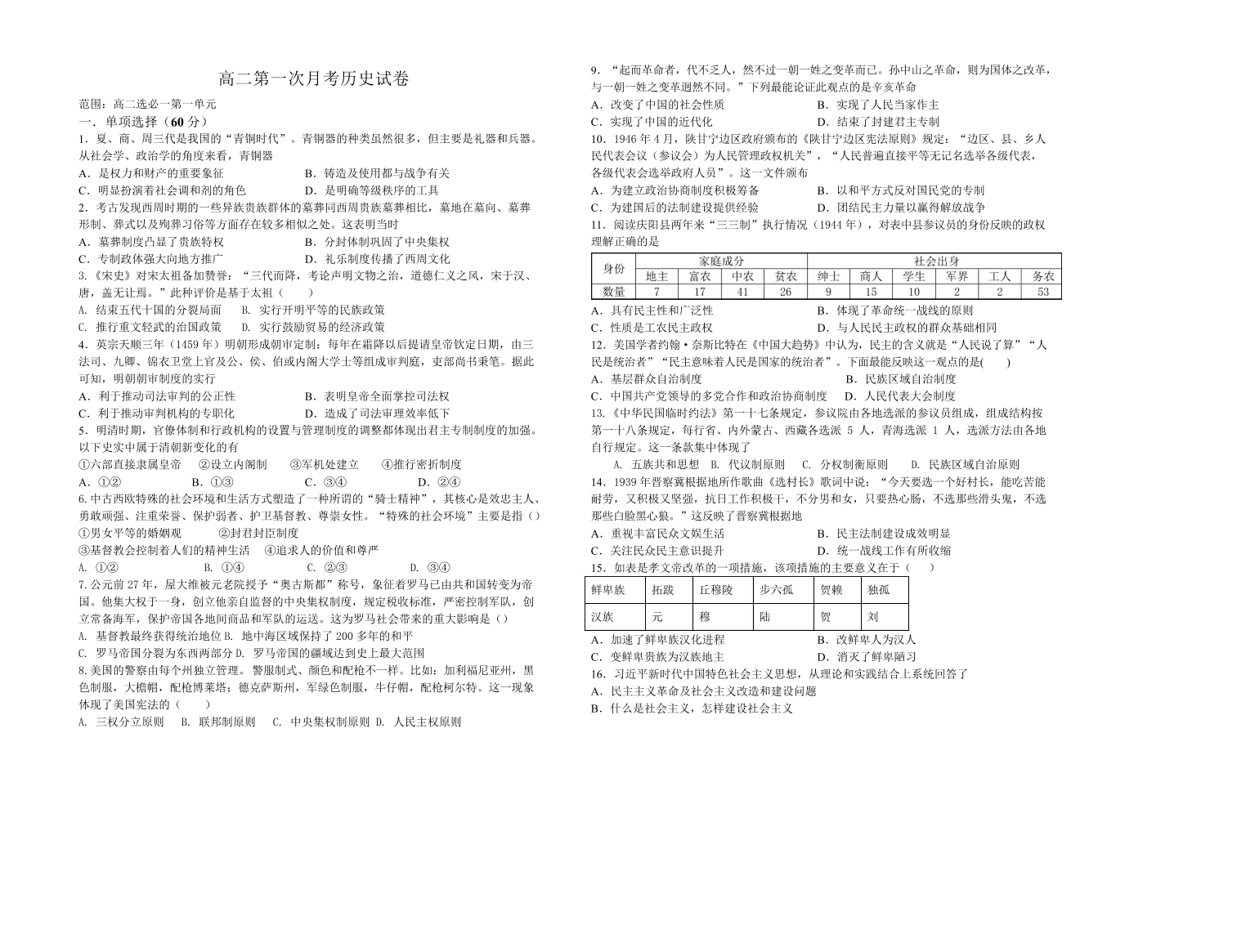 高二历史--江西省上饶市余干县私立蓝天中学2025-2026学年高二上学期第一次月考
