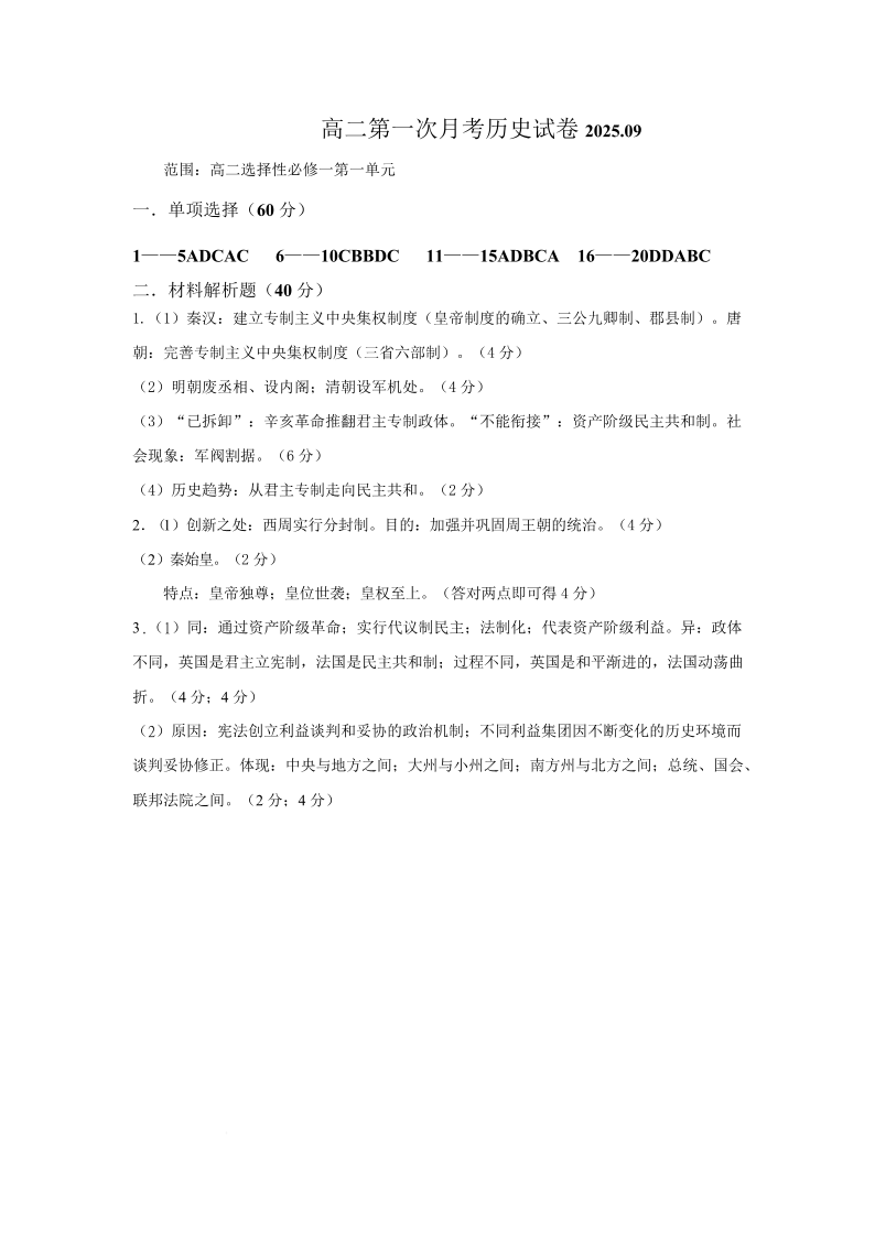 高二历史答案--江西省上饶市余干县私立蓝天中学2025-2026学年高二上学期第一次月考
