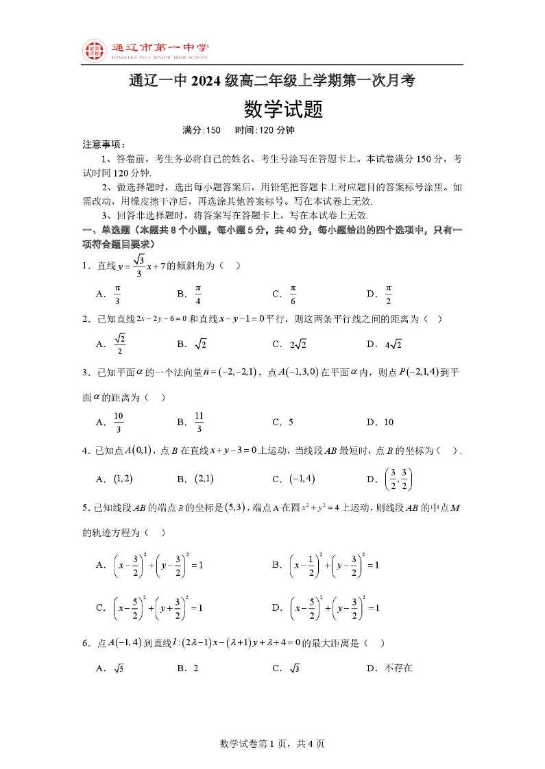 高二数学(普通班)--内蒙古通辽市第一中学2025-2026学年高二上学期第一次月考