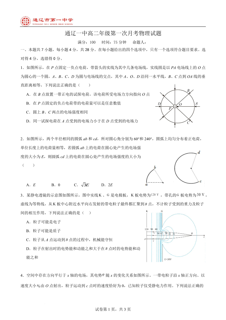 高二物理(特优班)--内蒙古通辽市第一中学2025-2026学年高二上学期第一次月考