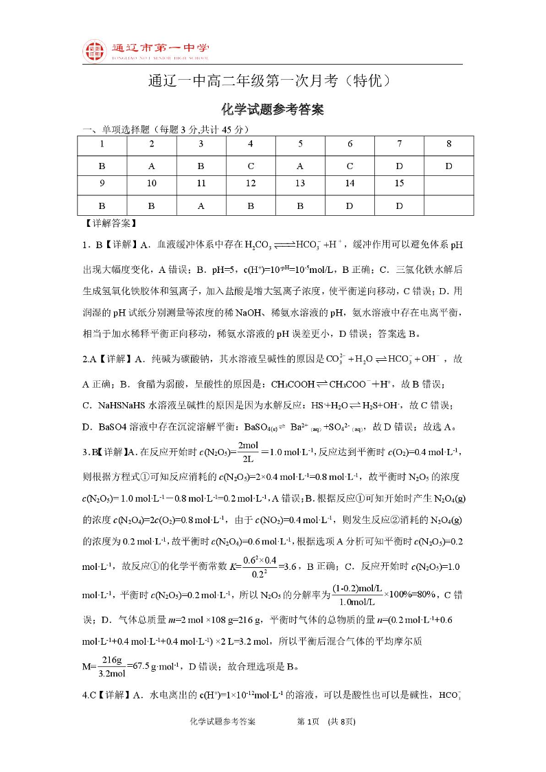 高二化学(特优班)答案--内蒙古通辽市第一中学2025-2026学年高二上学期第一次月考