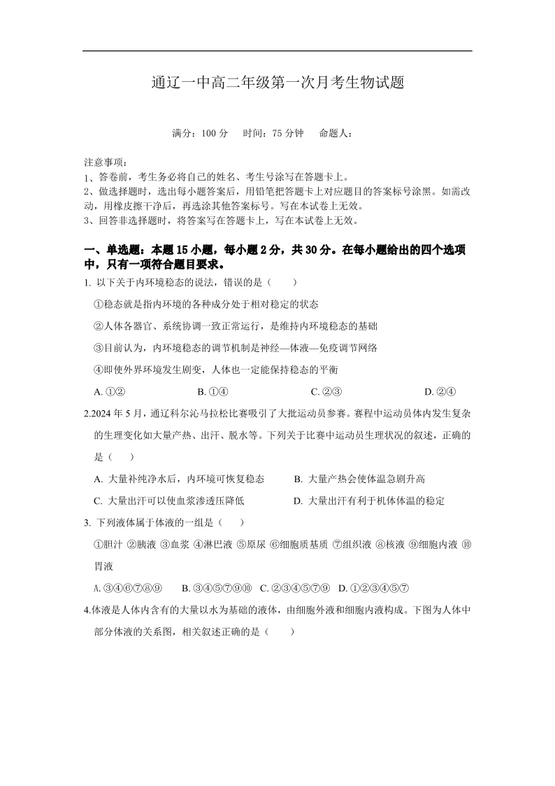 高二生物--内蒙古通辽市第一中学2025-2026学年高二上学期第一次月考