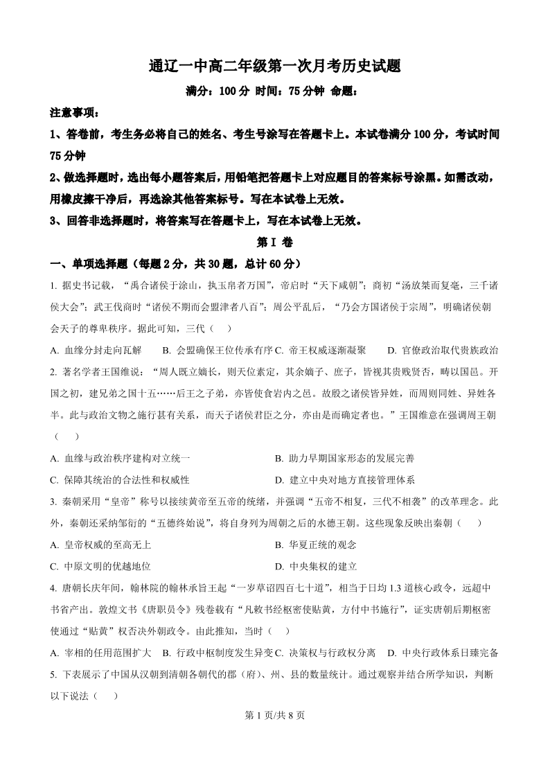 高二历史(原卷版)--内蒙古通辽市第一中学2025-2026学年高二上学期第一次月考