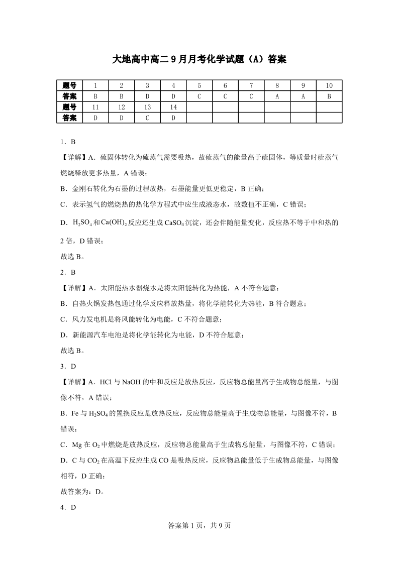 高二化学A卷答案--山西省朔州市怀仁市大地高中学校2025-2026学年高二上学期第一次月考