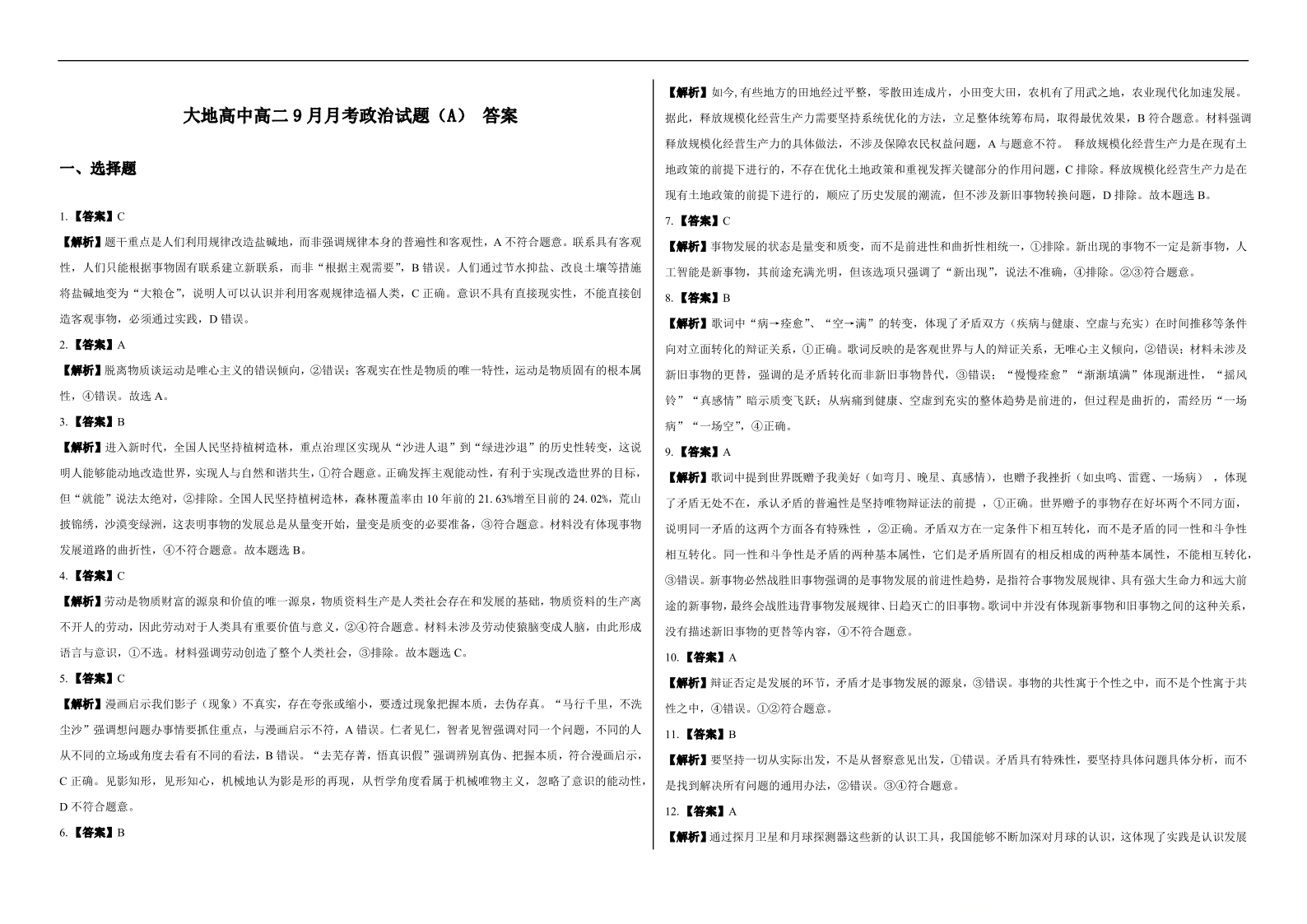 高二政治A卷答案--山西省朔州市怀仁市大地高中学校2025-2026学年高二上学期第一次月考