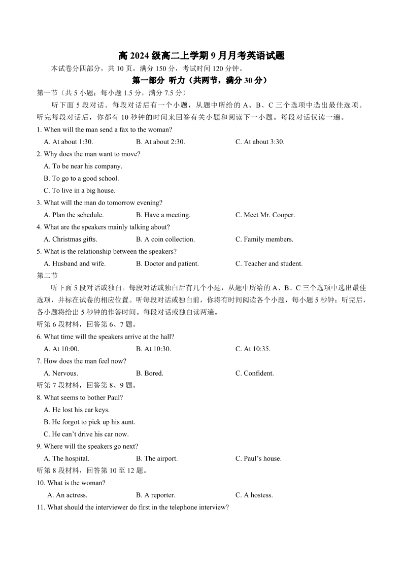 高二英语+答案--四川省达州市外国语学校2025-2026学年高二上学期9月月考