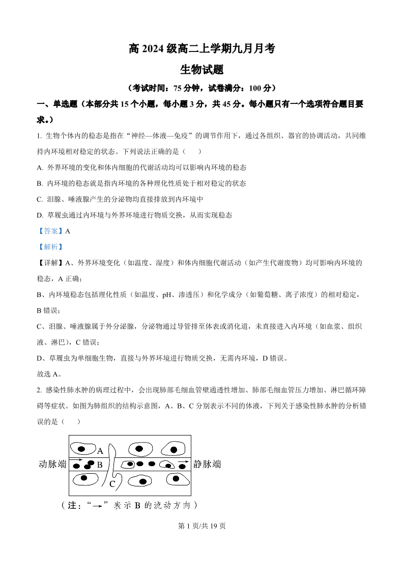 高二生物(精品解析版)--四川省达州市外国语学校2025-2026学年高二上学期9月月考