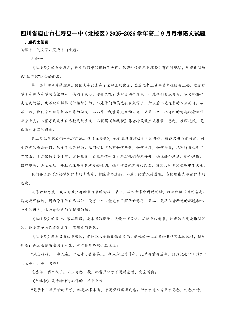 高二语文+答案--四川省眉山市仁寿第一中学校(北校区)2025-2026学年高二上学期9月月考