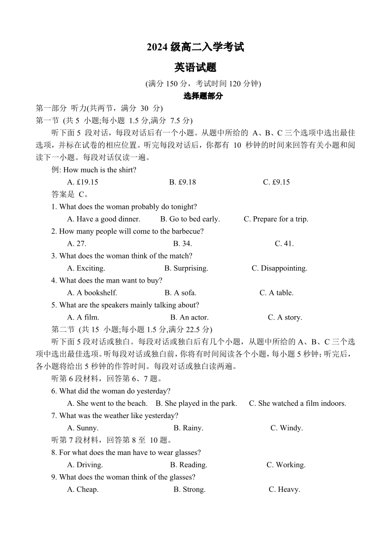 高二英语--四川省眉山市仁寿第一中学校(北校区)2025-2026学年高二上学期9月月考