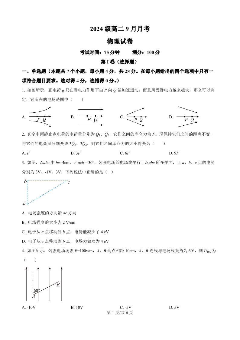 高二物理(原卷版)--四川省眉山市仁寿第一中学校(北校区)2025-2026学年高二上学期9月月考