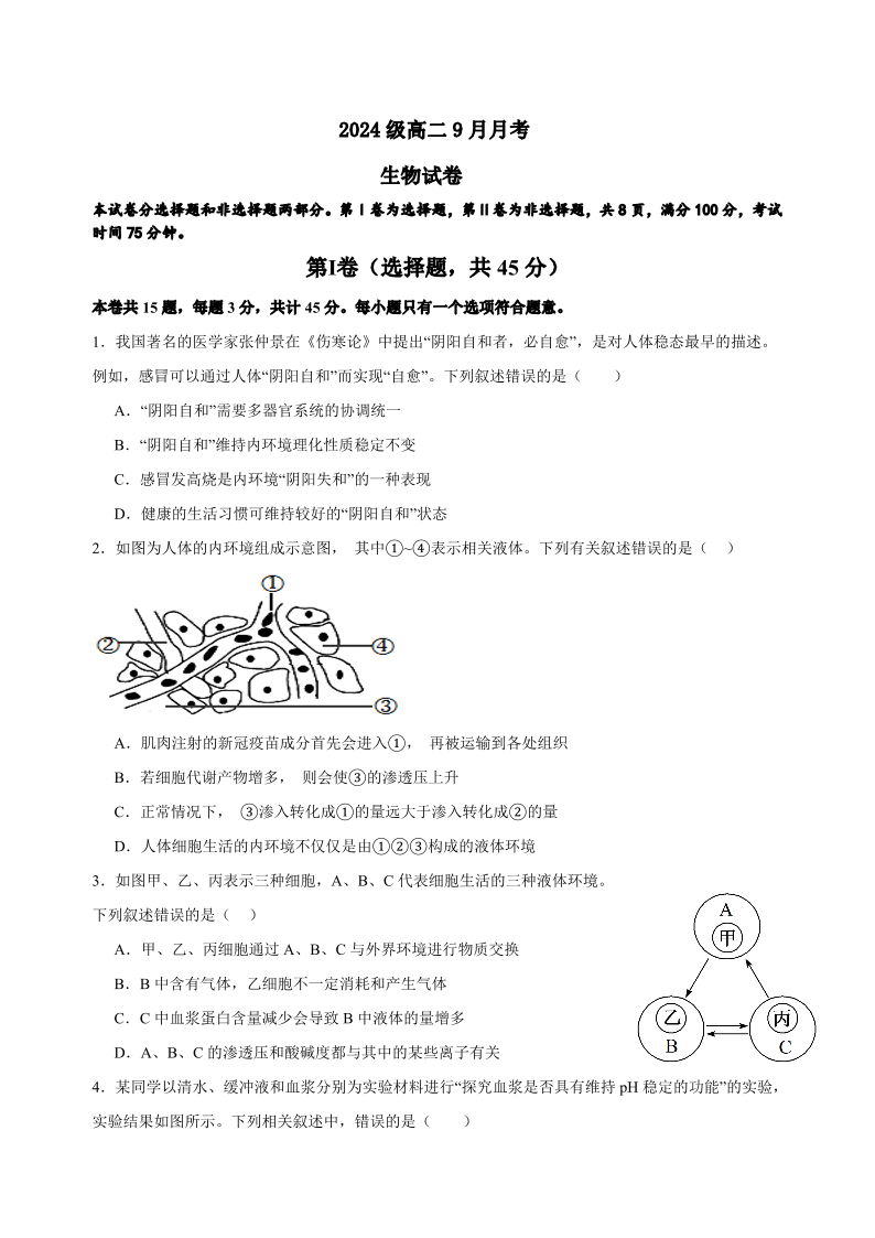 高二生物--四川省眉山市仁寿第一中学校(北校区)2025-2026学年高二上学期9月月考