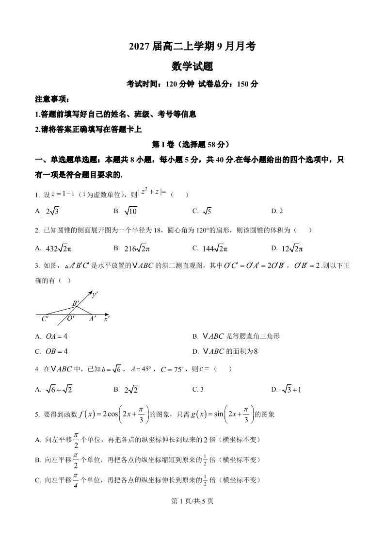 高二数学(原卷版)--四川省眉山市仁寿第一中学校(南校区)2025-2026学年高二上学期9月月考