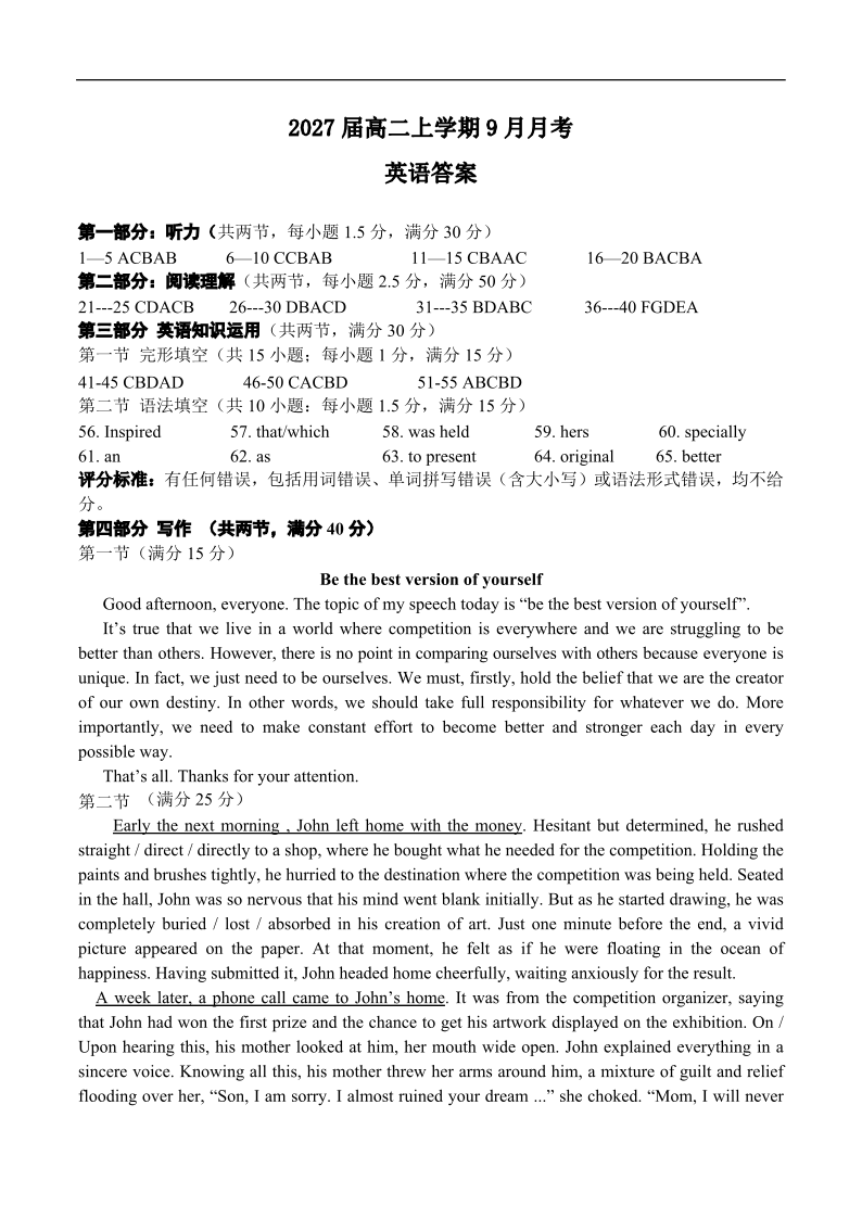高二英语答案--四川省眉山市仁寿第一中学校(南校区)2025-2026学年高二上学期9月月考
